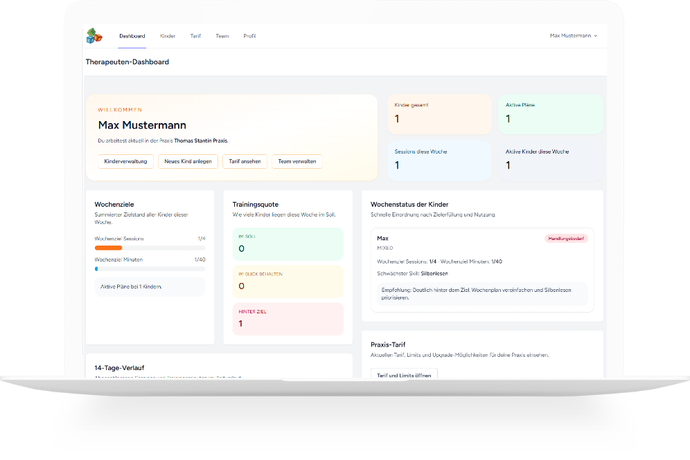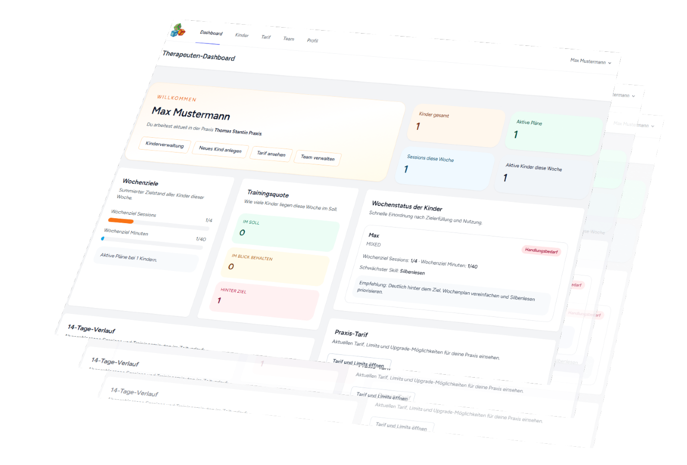 Die Plattform bildet den kompletten Arbeitsablauf einer Lerntherapie-Praxis digital ab: von der Praxisanlage ueber Kinderprofile und Trainingsplaene bis hin zu Elternkommunikation, Zugangskarten und Berichten.